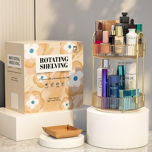 TCHCWYS 360° Rotating Makeup Organizer for Vanity, Large Capacity Skincare Organizer, Perfume Organizer, Bathroom Countertop Organizer (Elegant Gold, 2 Tire)