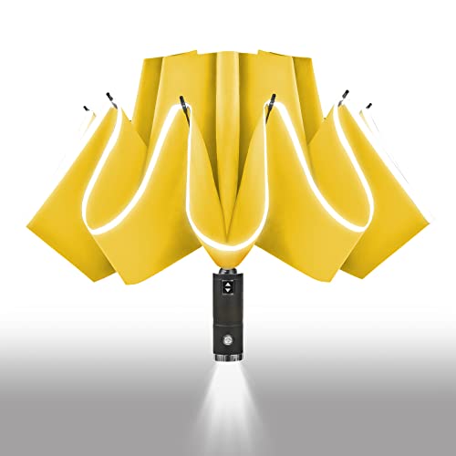 New Upgrade Reverse Folding Umbrella:This newest reverse folding umbrella is compact,portable and easy carrying, this is an upgrade design of the longer umbrella inverted. Inverted design is different from regular automatic umbrella which keeps the wet outside surface inside and prevents water from flowing downwards, keeping floors and cars dry when close it. Bring you with great convenience when bring it inside in rainy dayLed Umbrella Handle with Lights And Quick Auto Open Close: Lighted umbrella makes your life much easier in the rain/low visibility conditions. Folding inverted LED umbrella portable windproof compact have a fully automated system, perfect for one hand operation. This inverted umbrella automatic open close at the touch of the button. Also comfortable to hold and easy to grip. A portable windproof travel/business umbrella for you360° High Light Safety Reflective Strip:Walking in the rainy night is very unsafe,It is difficult for drivers to see pedestrians in heavy rain.This folding inverted umbrella with 360°highlight reflective edge to alert drivers in low light rainy conditions and dark night, so that they can notice you 500 meters away to prevent collision and protection your safeSuperior Windproof and Waterproof:Lejorain windproof umbrella is fortified with 9 resin-reinforced fiberglass ribs.This windproof travel umbrella is flexible enough to withstand powerful wind without turning inside out. Lejorain travel umbrella have a premium quality canopy which is made of pongee, could highly water repellent and quick dryingLejorain:There are different colors to choose from to provide you with good quality golf umbrellas from experienced golf umbrella makers
