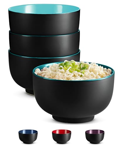 KooK Ramen Bowl, Japanese Bowls, Noodle Bowls, Large Soup Bowl, Ceramic, Large Capacity, For Ramen, Pho, Udon, Soba, Microwave and Dishwasher Safe, 34 oz, Set of 4 (Black/Teal)